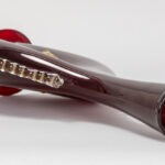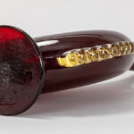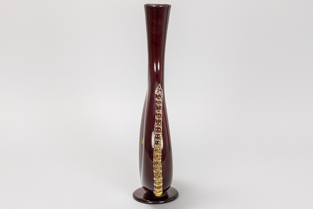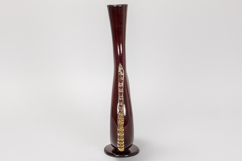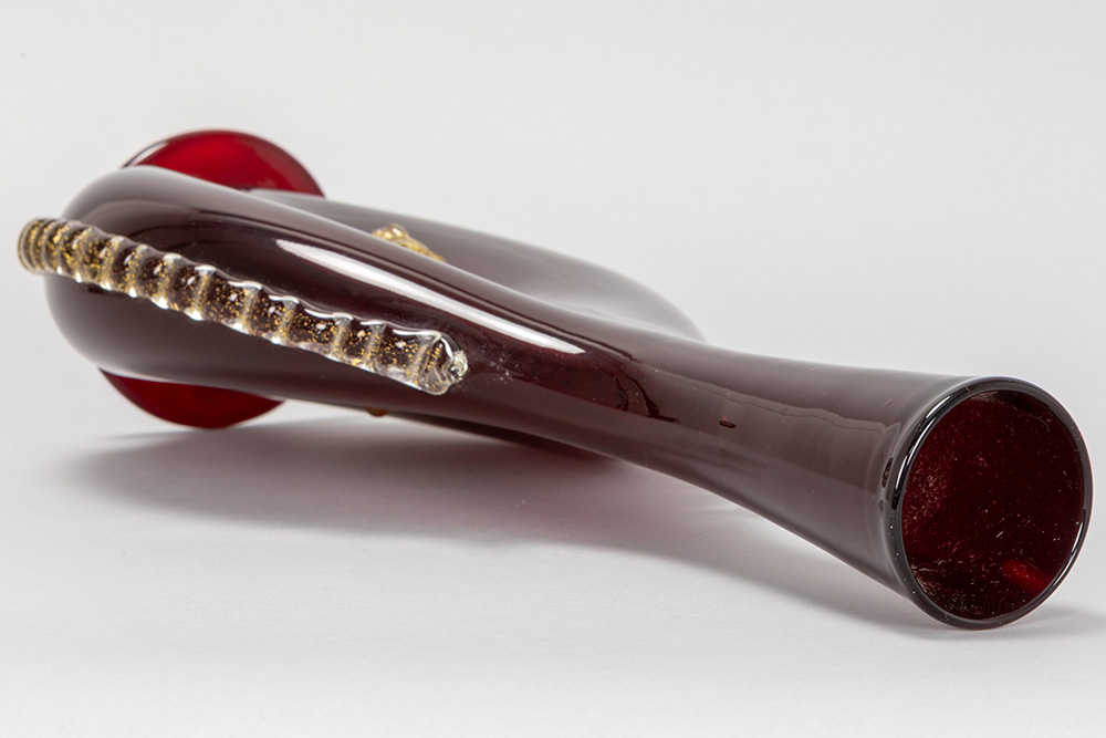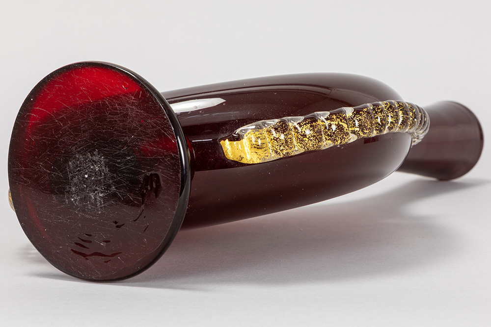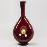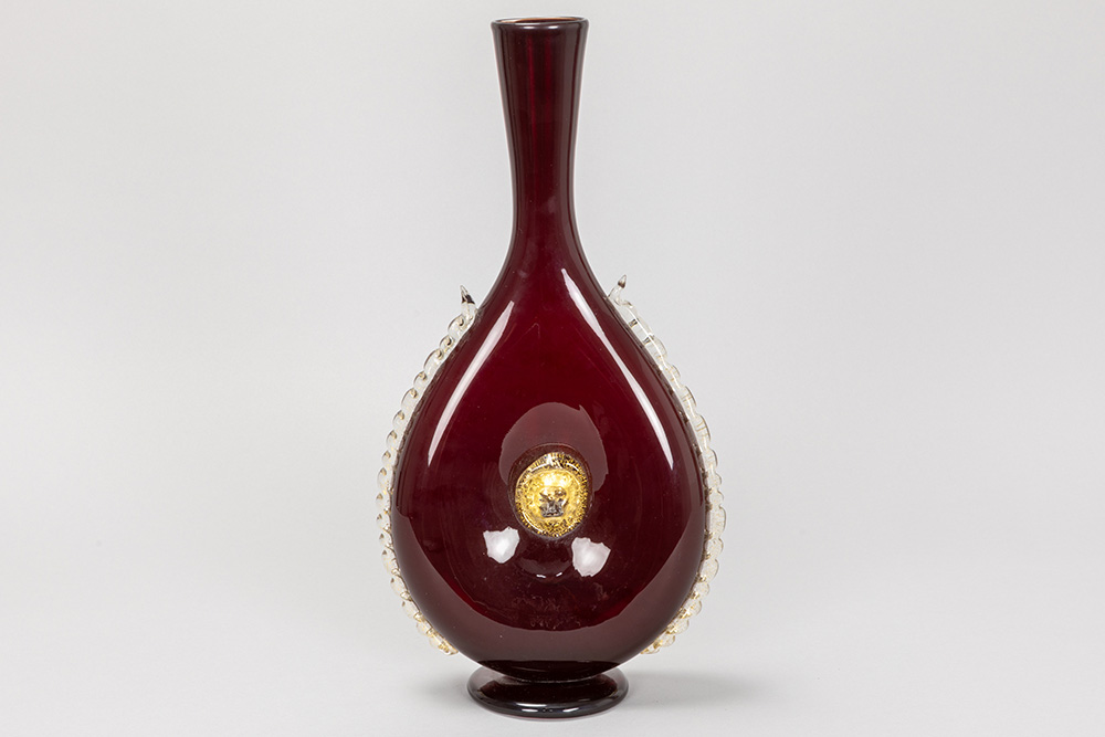 a rare Antonio Salviati (attributed) bottle-shaped vase in blood-red Murano glass with on both sides a gold-applied lion’s head – to be dated around 1850
