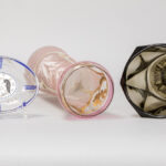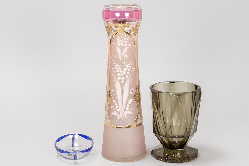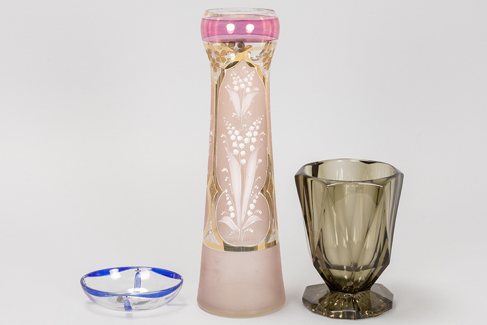 lot (3) with a crystal Art Nouveau vase attributed to Josephinenhütte, a soap dish attributed to Otto Prutscher for Steinschönau and a Art Deco vase attributed to Stölze / Hermanova Hut