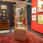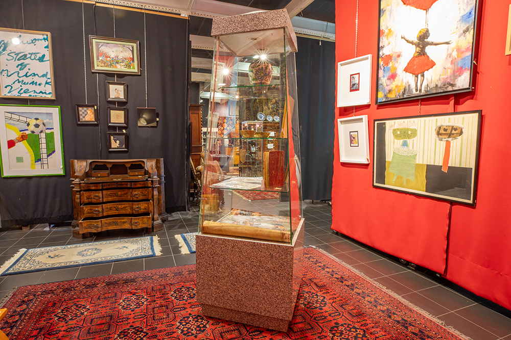 Winkelvitrine met obeliskvorm in glas en graniet – hoogte : ca 220 cm – met verlichting en deur