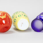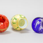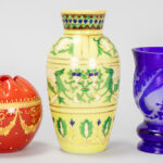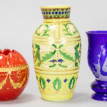 GRAF HARRACH GLAS HÜTTE lot (3) te dateren rond 1900 : – vaas in melkglas met email – hoogte : 19 cm – vaas in kristal met handgeëtst blauw cameo decor – hoogte : 13,5 cm – komvormige vaas rijkelijk opgehoogd met goud – hoogte en breedte : 10 x 11 cm