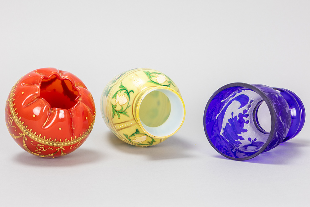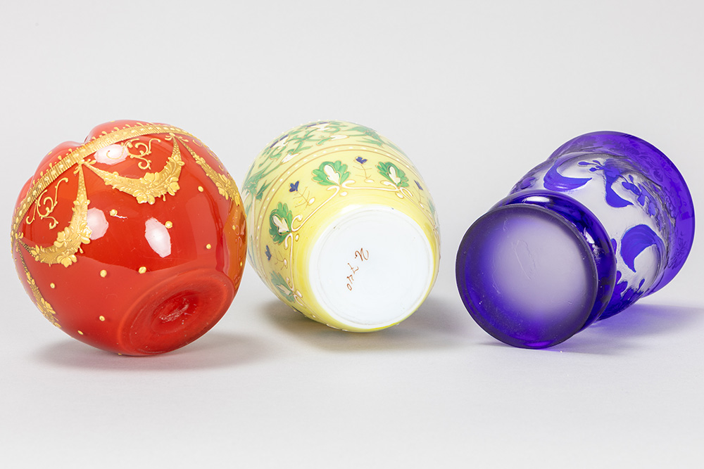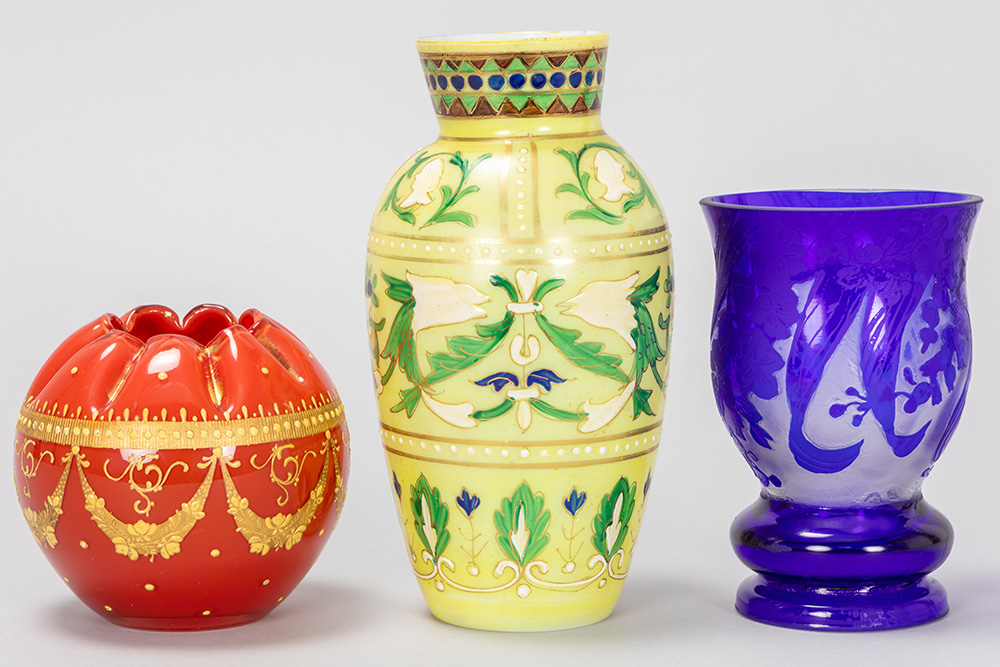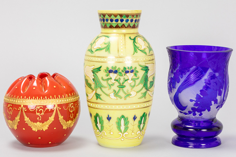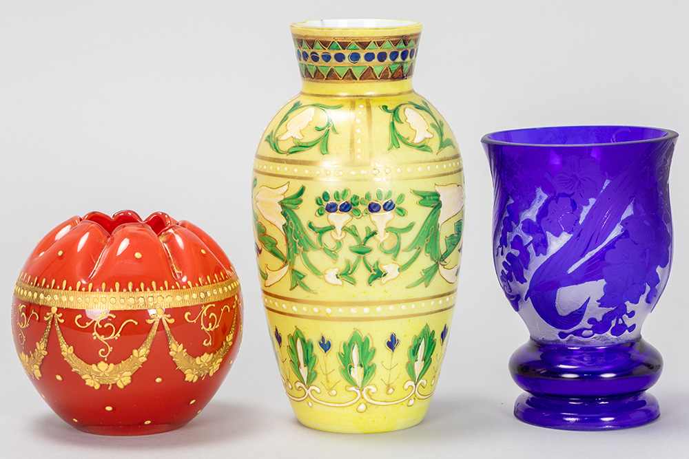 three pieces of Graf Harrach Glas Hütte to be dated around 1900, a milk-glass vase with enamel, a crystal cameo hand-etched vase with blue overlay and a red rosebowl glass vase with thick gilding