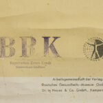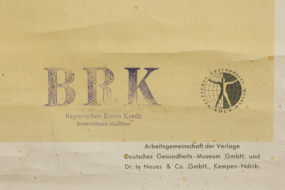 Oude Duitse onderwijsprent/schoolplaat met de voorstelling van een skelet – 190 x 84 met “BRK” (Bayerische Rotes Kreuz) stempel
