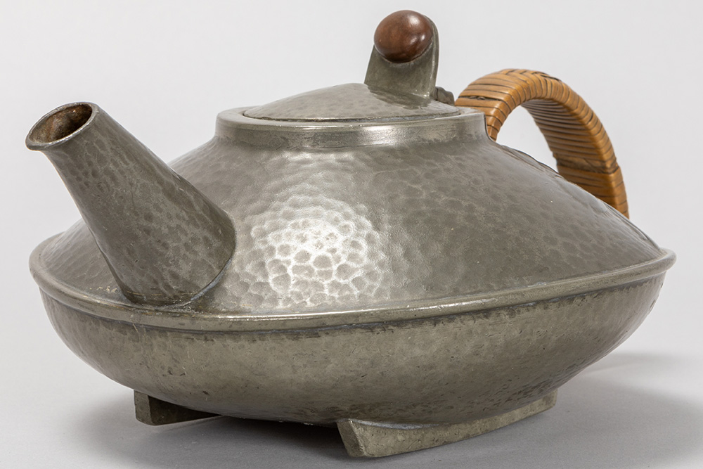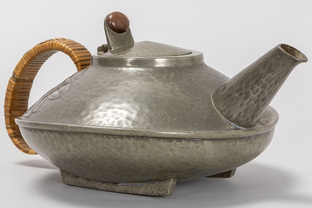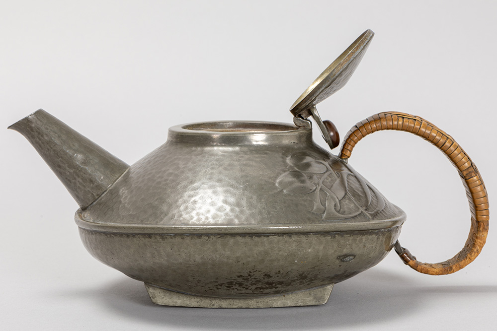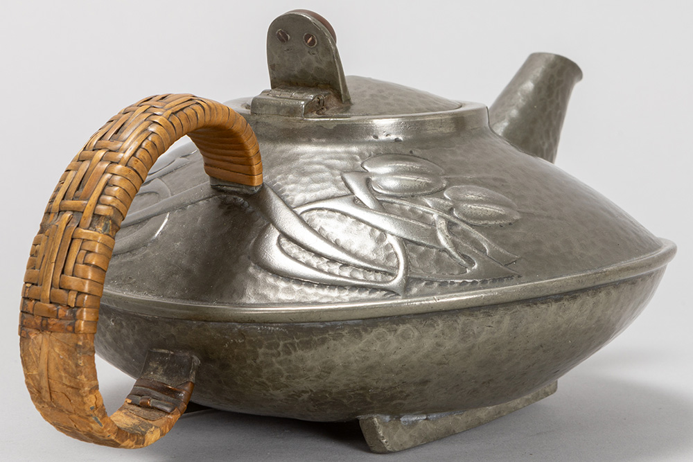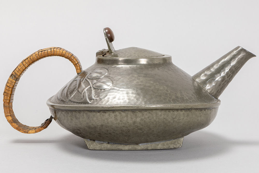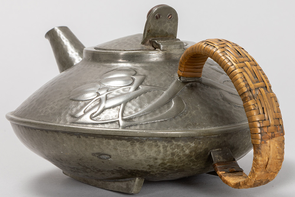 ARCHIBALD KNOX (1864 – 1933) voor Liberty Art Nouveau-theekan in tin – hoogte en breedte : 18 x 25 cm gemerkt