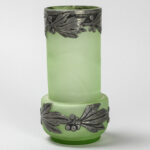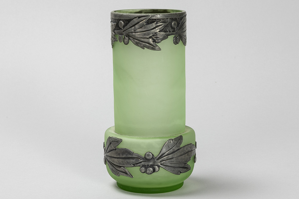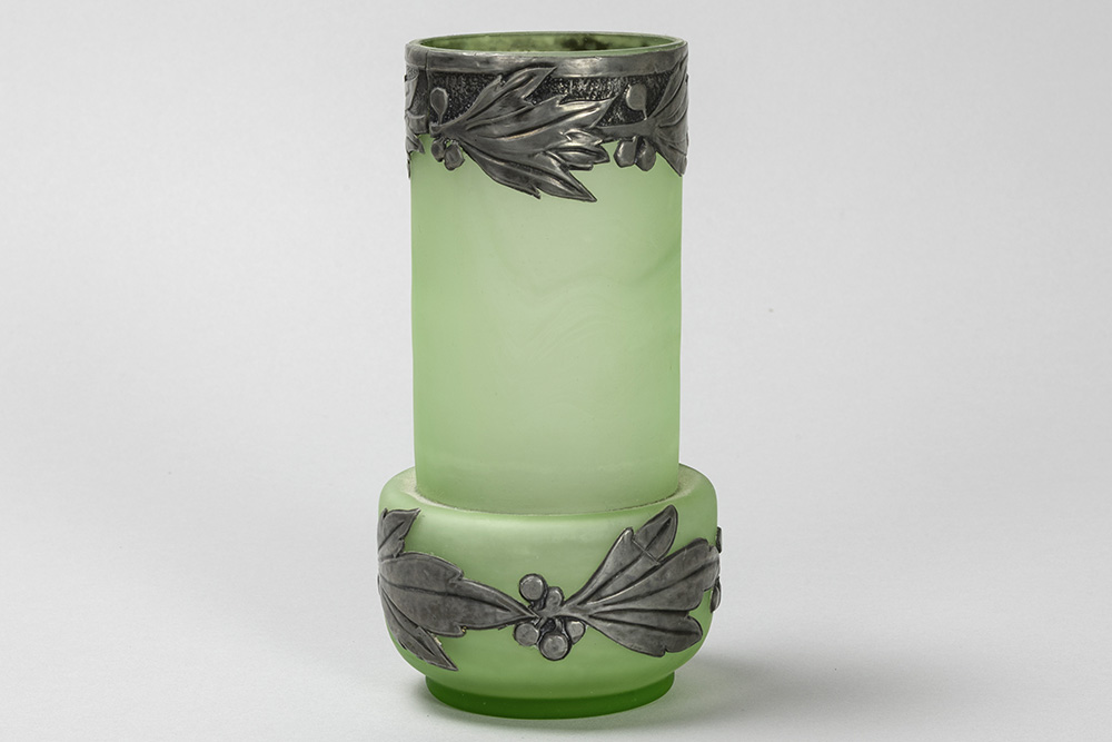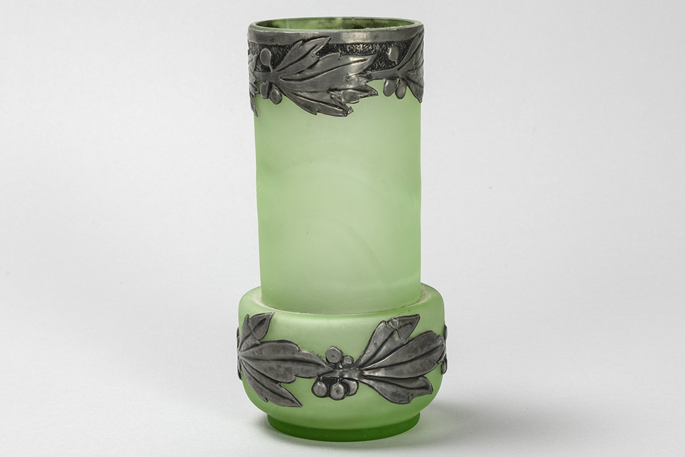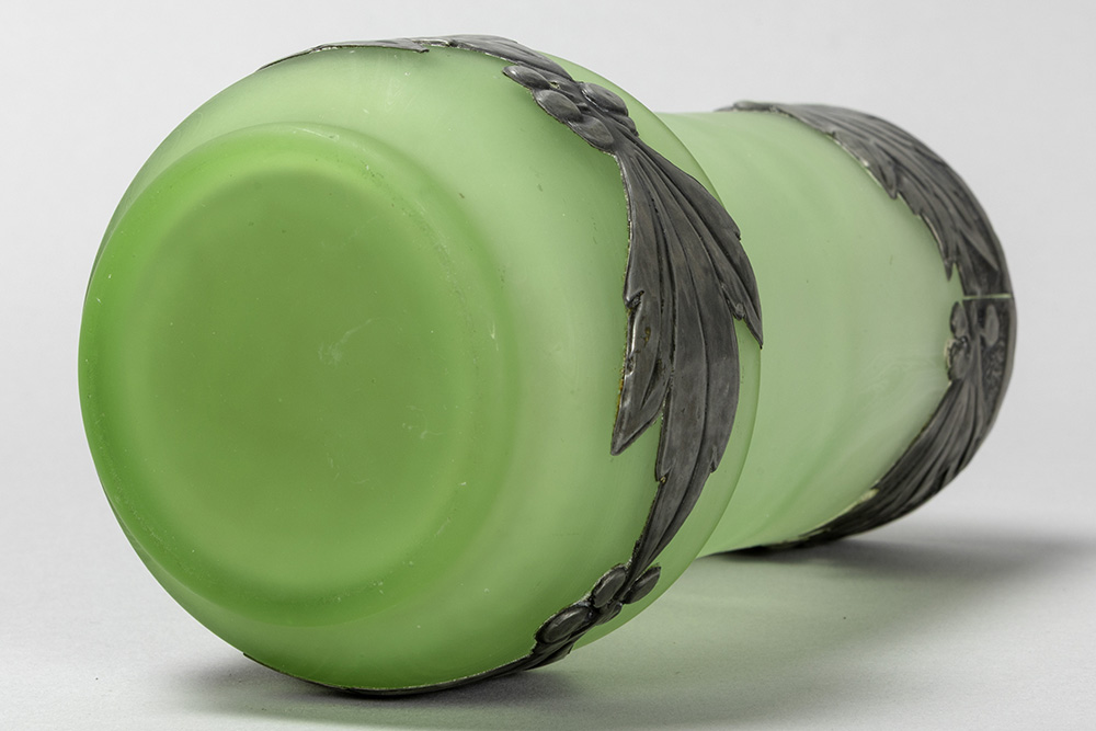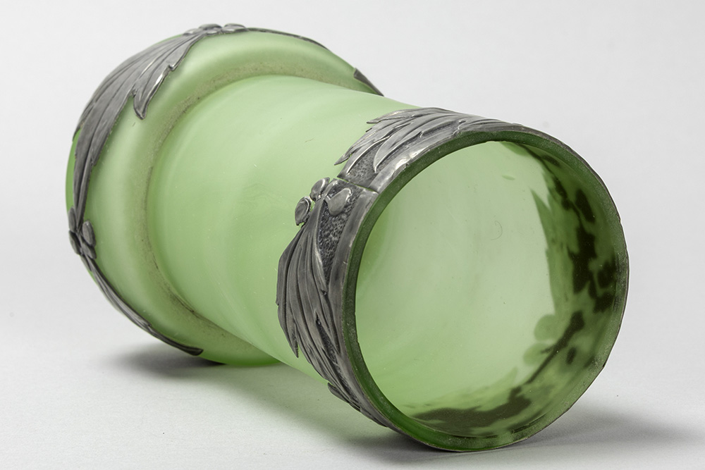 Art Nouveau-vase in light green glass with mountings in pewter