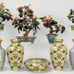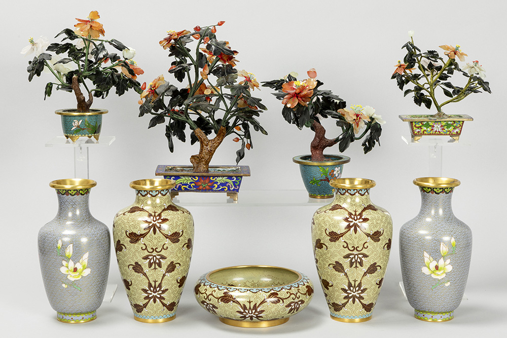Lot (9) Chinese cloisonné met een paar vazen, een driedelig kaststel en vier jardinières met bloemen in ‘jade’