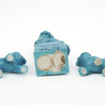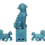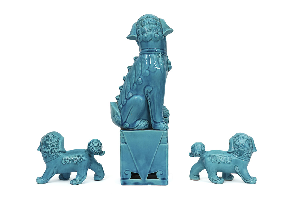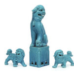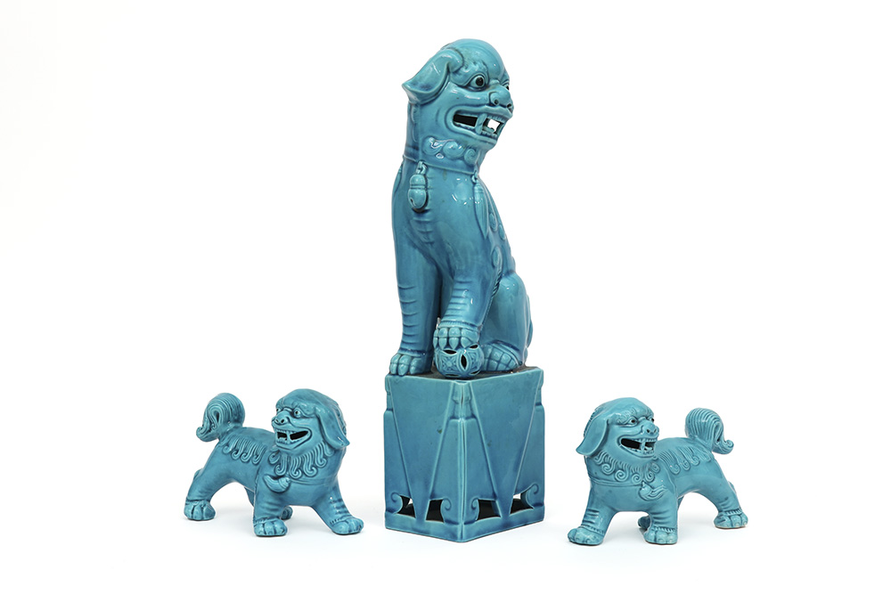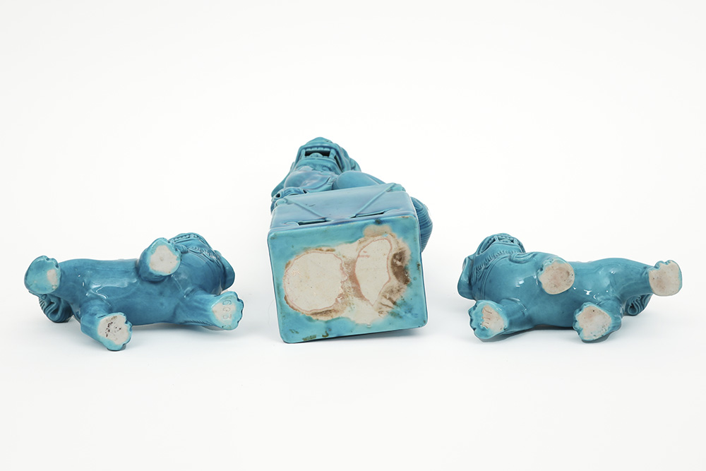 Lot (3) van een grotere en twee kleine “fô”-honden in Chinees porselein met turkooisblauwe glazuur – hoogtes van 9 tot 31,5 cm
