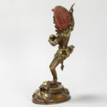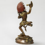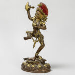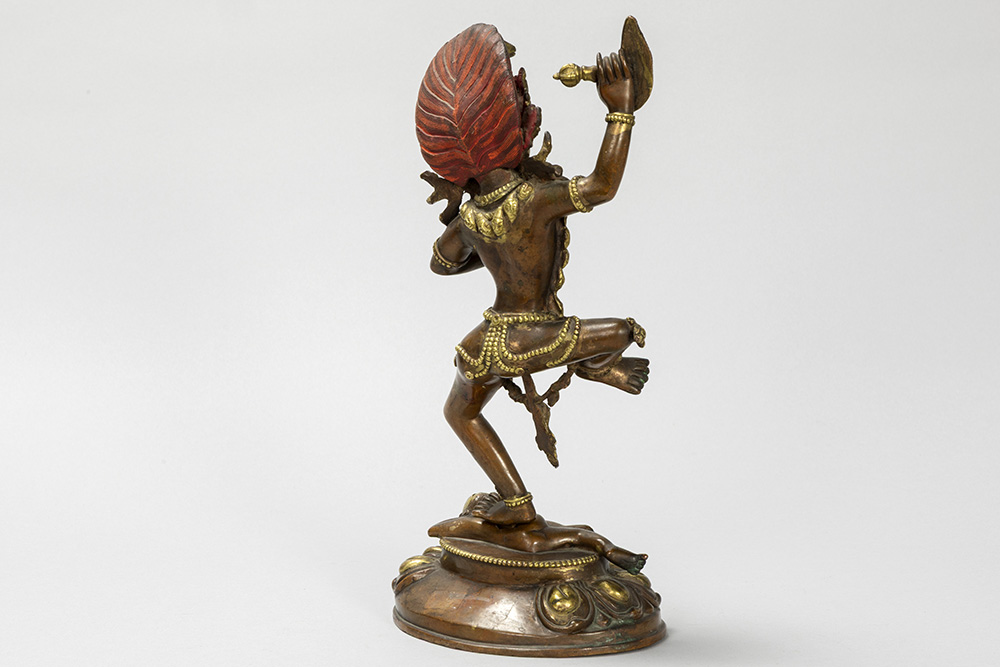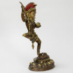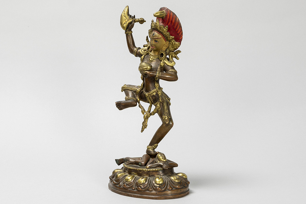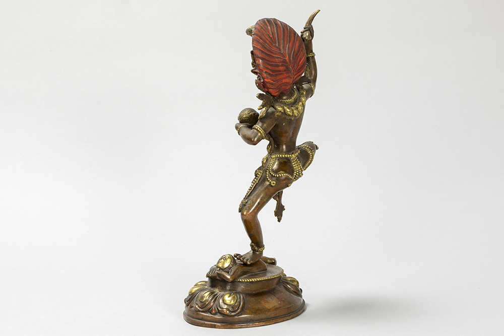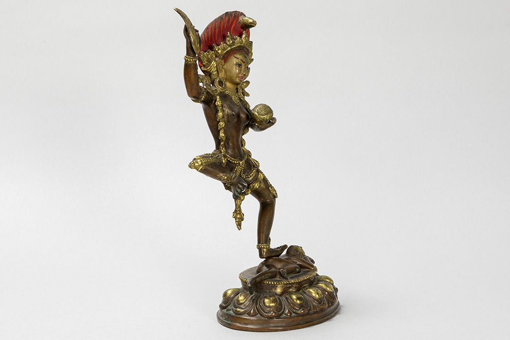 Tantrisch-boeddhistische sculptuur in een koperlegering met restanten van de originele dorure en met polychromie : “Vajravarahi met lotusbloem in de ene hand en een kartrikka in de andere” (staand op een menselijke figuur) – hoogte : 30 cm