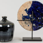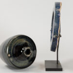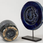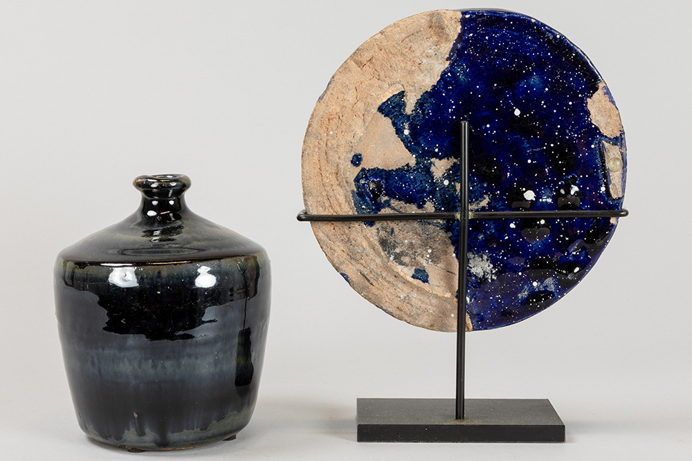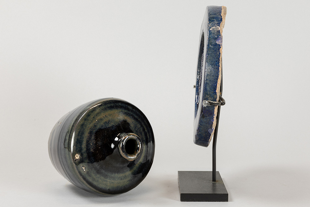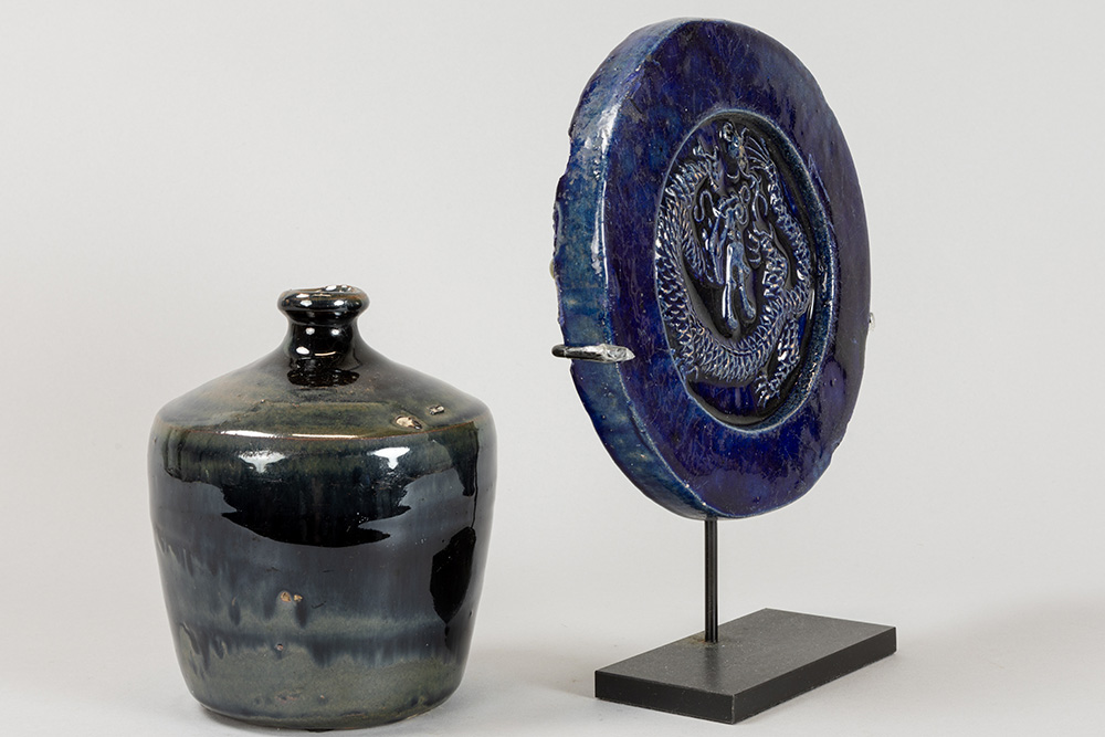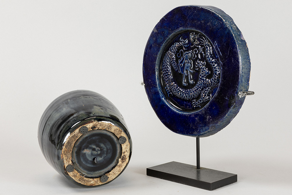 Lot (2) Chinees blauw geglazuurd aardewerk : kruikje (15,2 cm hoog) en schijf met bas-reliëf met draak (diameter : 18,5 cm)