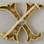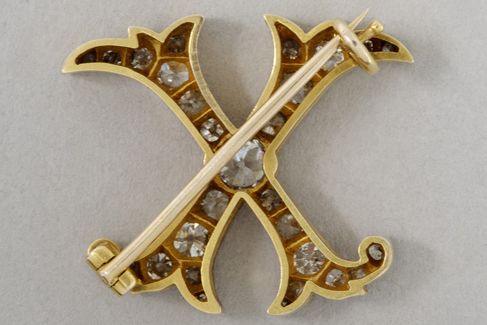 Antieke, allicht Russische, X-vormige broche in geelgoud (14 karaat) bezet met zgn “old European Cut” diamanten