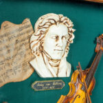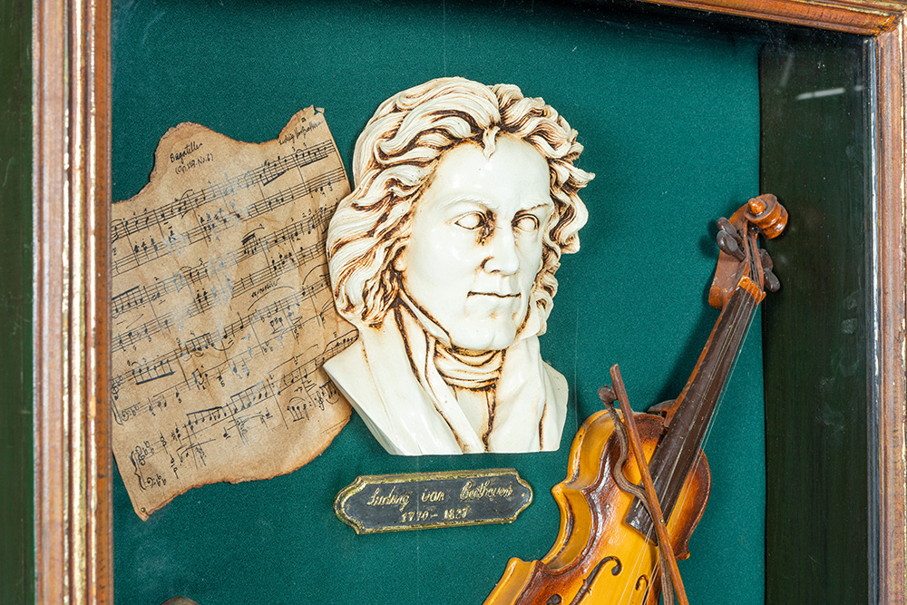 display cabinet with a still life with a bust of Beethoven, scores, violin and horn