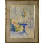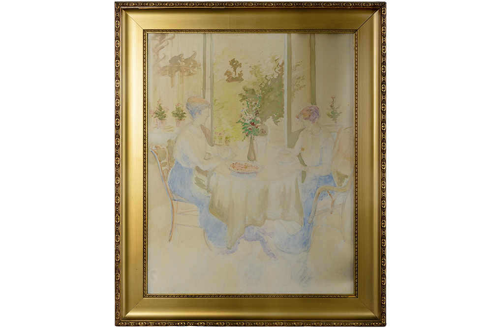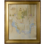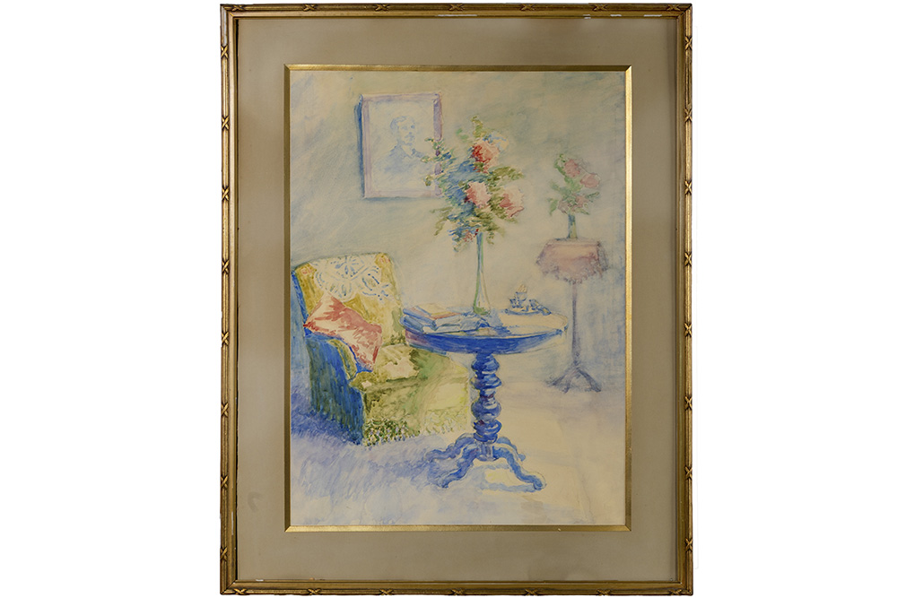 Twee aquarellen met typische voorstellingen : “Dames aan tafel” en “”Zicht op een leeskamer” – 70 x 55 en 65 x 47