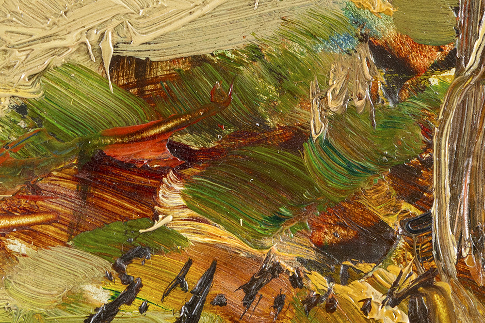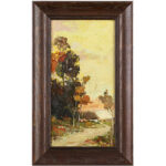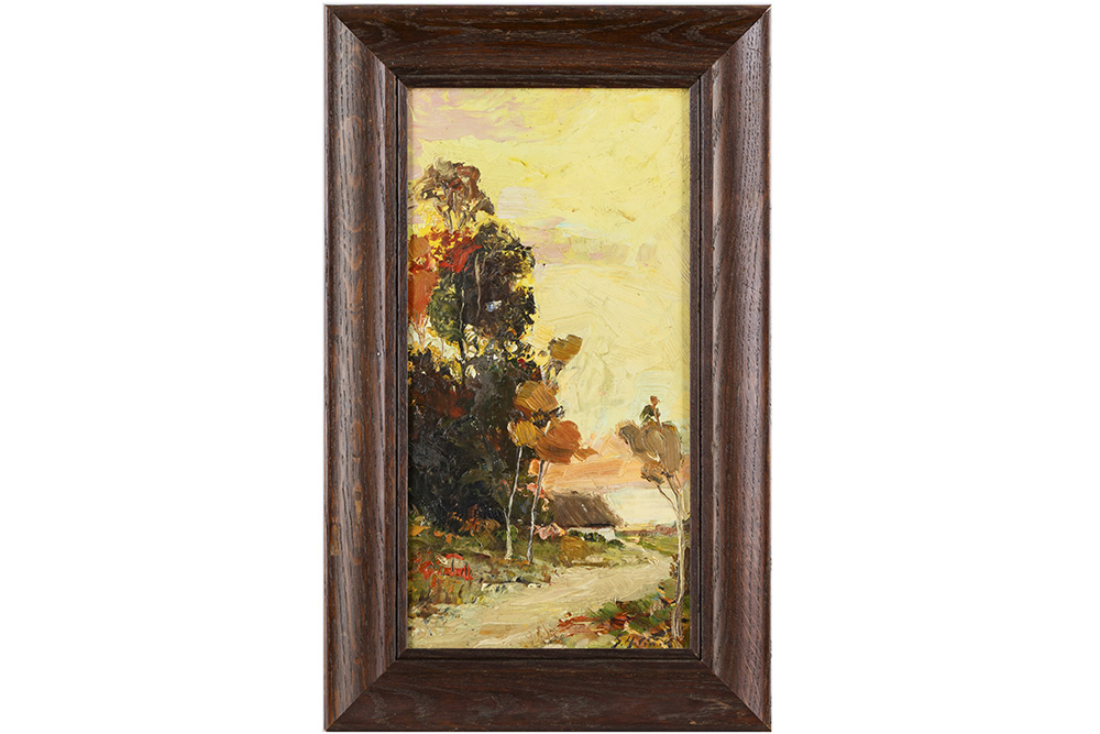 HELINCK GUSTAVE (1884 – 1954) olieverfschilderij op paneel : “Herfstlandschap met bomen en huis” – 40 x 21 getekend