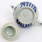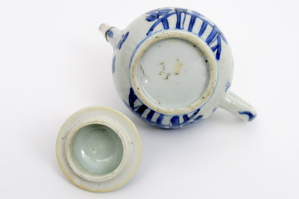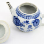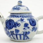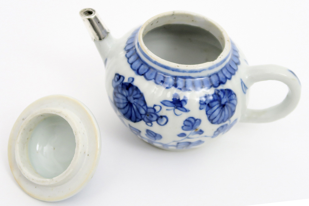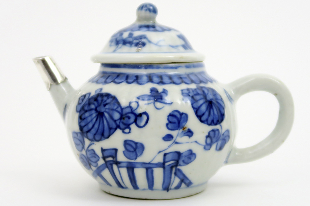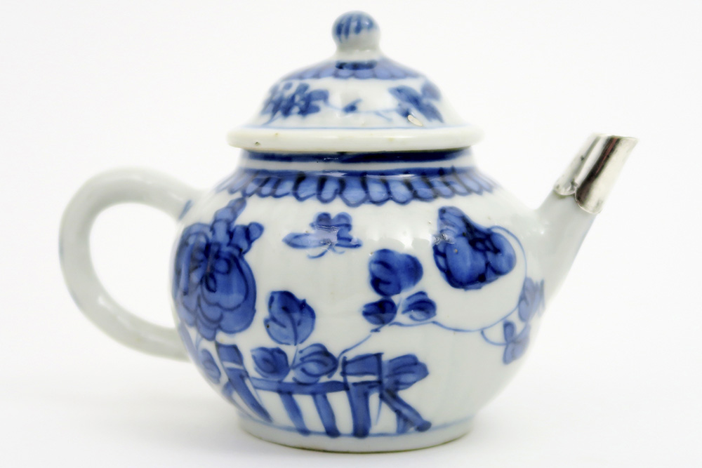 Achttiende eeuwse Chinese Kang Hsi – theepot in porselein met een blauwwit bloemen- en vlinderdecor en met zilveren teut – hoogte : 9,5 cm