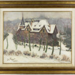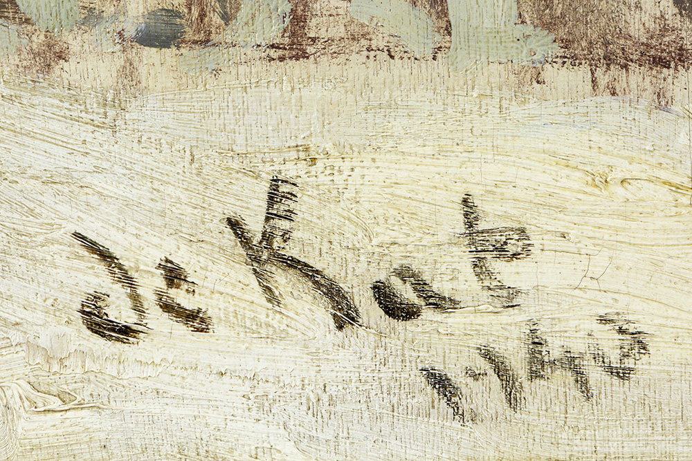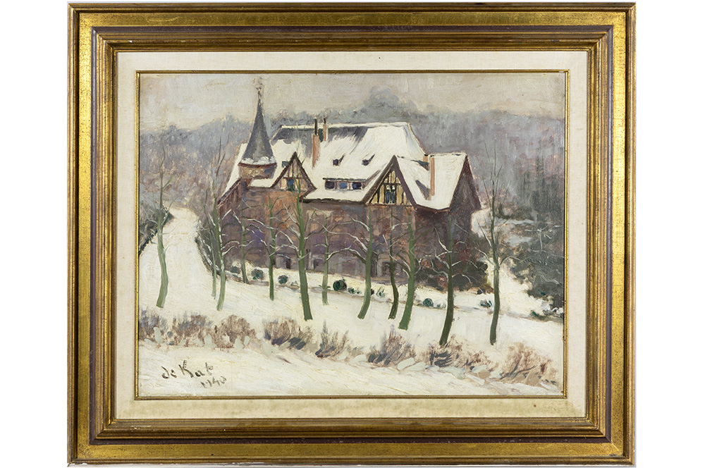 DE KAT olieverfschilderij op paneel : “Winterlandschap met kasteel” – 45 x 58 getekend en gedateerd 1940