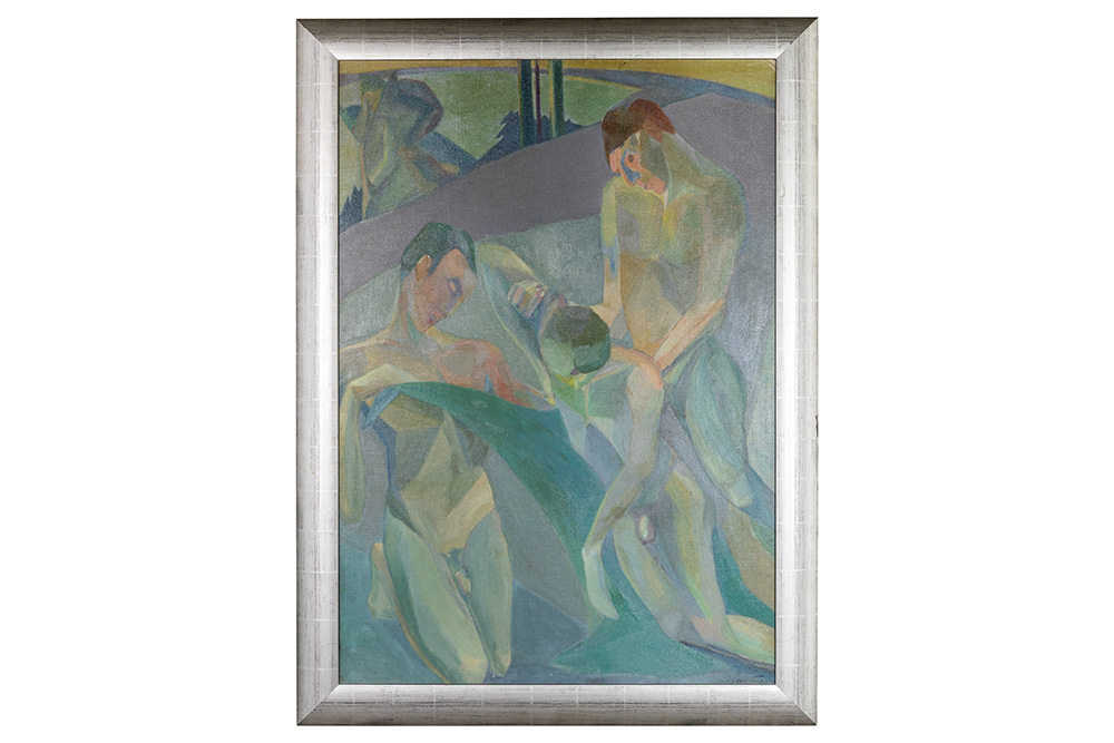 Onleesbaar getekend olieverfschilderij op doek : “Drie naakte mannen” – 103 x 73