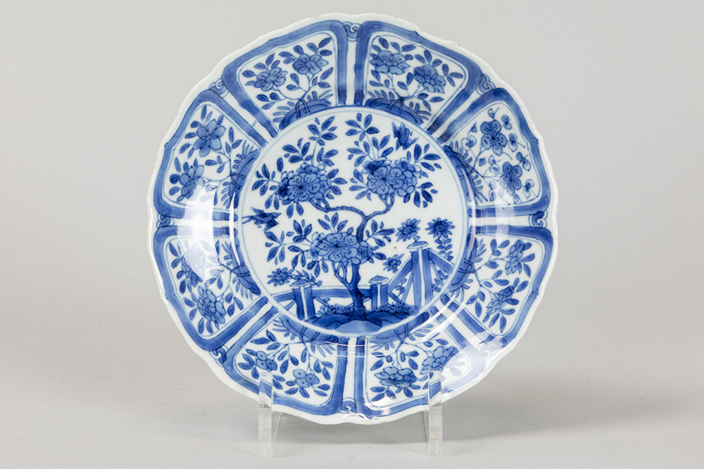 Mooi zeventiende/achttiende eeuws Chinees KangXi-bordje in gemerkt porselein met een blauwwit decor met bloemenstruik in tuin – diameter : 16,5 cm