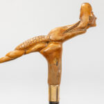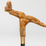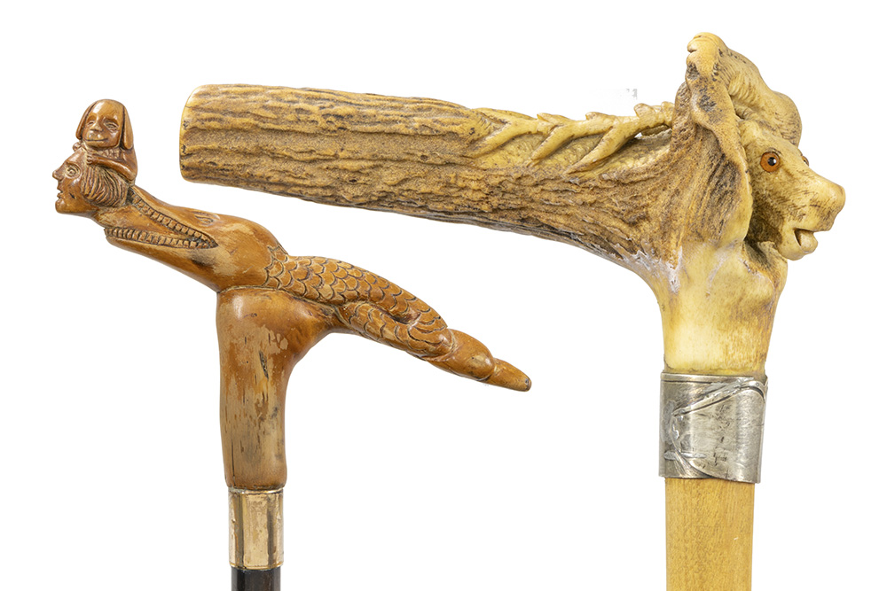 two “Folk Art” walking sticks, one with a grip in the shape of an animal’s head and one with human face