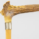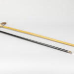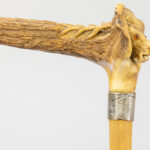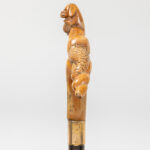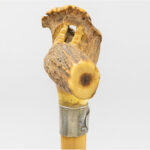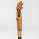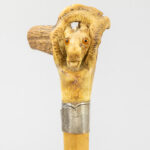 Lot met twee wandelstokken (volkskunst) één met een greep in de vorm van een dierenkop en één met humane kop – 9 en 94 cm hoog