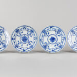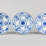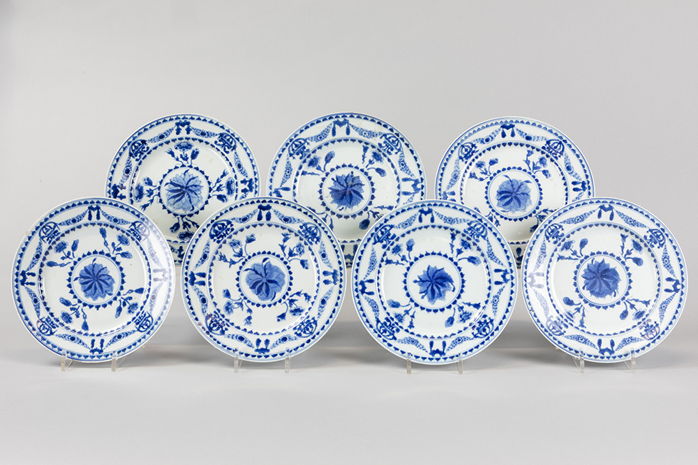 Serie van zeven laat achttiende eeuwse Chinese borden in porselein met een floraal blauwwit decor met guirlandes – diameter : 21,5 cm