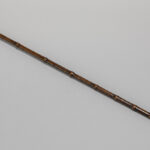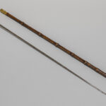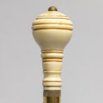 Negentiende eeuwse Europese wandelstok met een totale hoogte van 87 cm met afschroefbare greep in ivoor, die een degen verbergt, met een ajuinvorm uitlopend op een tapse baluster, versierd met vrij diep ingekerfde parallelle banden die nog sporen van de oorspronkelijke polychromie tonen en de knop die bekroond wordt door een halve bol in metaal – met bevestigingsring in koper