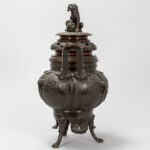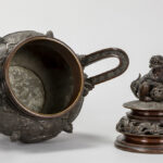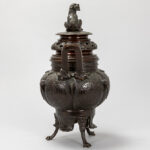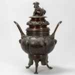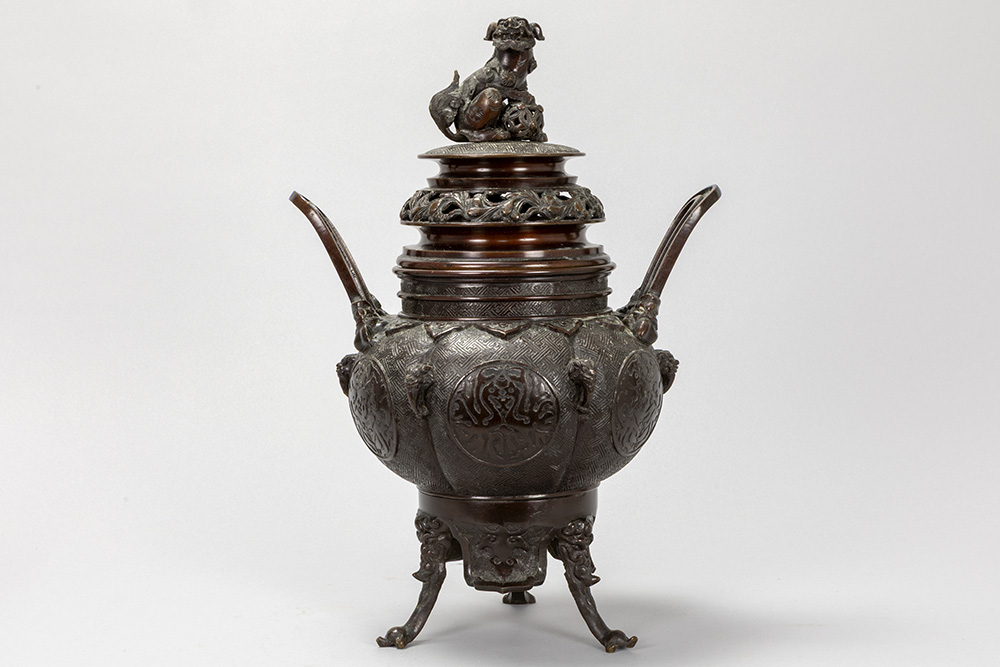 antique Oriental bronze incense burner with its lid with temple lion and with elephant heads