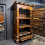 Zeer goed zeventiende eeuws Vlaams renaissancemeubel in blonde eik, versierd met typische ornamentiek in notelaar en ebbenhout met drie deuren en een lade – ca 1640 – 202 x 127 x 66 cm